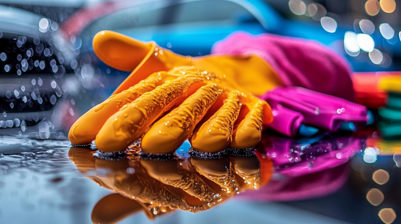La préparation constitue la première phase essentielle d'un lavage réussi. Avant d'enfiler le gant, il convient de rincer abondamment le véhicule à l'eau claire pour éliminer les particules de poussière et de sable qui pourraient créer des micro-rayures lors du passage du gant. Une fois cette étape préliminaire accomplie, préparez une solution de mousse de lavage en respectant les proportions recommandées par le fabricant, généralement un litre de produit dilué dans un seau d'eau tiède. Enfilez ensuite le gant et plongez-le dans la solution savonneuse jusqu'à saturation complète du caoutchouc. Travaillez par sections en effectuant des mouvements circulaires légers, en commençant toujours par le haut du véhicule pour descendre progressivement vers les parties basses plus encrassées. Rincez régulièrement le gant dans un second seau d'eau claire pour éviter de redéposer les saletés sur la carrosserie fraîchement nettoyée. Après avoir traité l'ensemble du véhicule, procédez à un rinçage final abondant avant de sécher avec une microfibre appropriée. Pour les finitions, l'application d'un rénovateur extérieur peut raviver l'éclat des plastiques et des joints, complétant ainsi le traitement global de la carrosserie.